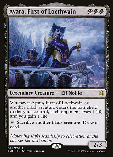 For an extra mana, Ayara, First of Locthwain offers much better early game utility. Her life drain ability works when creatures enter, so as we build our army and assemble the combo we earn some incidental life gain to help stabilize our position. Additionally, her tap ability can provide once-per-turn card draw if there are disposable creatures lying around. She's a decent consideration for an Aristocrats combo commander since she ticks off the sacrifice payoff box.
