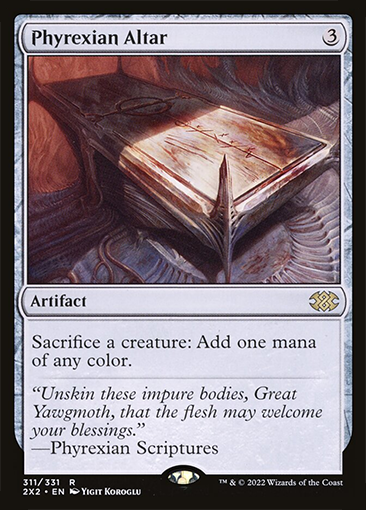 Phyrexian Altar and Warren Soultrader effectively do the same trick — sacrifice a creature for one mana — but Warren Soultrader's cost of one life isn't negligible. If one of our payoffs doesn't actually net us life, the Warren Soultrader combo will only let us win if our life total is higher than our opponents'. Also, cards that make artifacts enter the battlefield tapped like Blind Obedience, or that remove all artifact abilities like Collector Ouphe, will completely stop the combo from getting past step one.