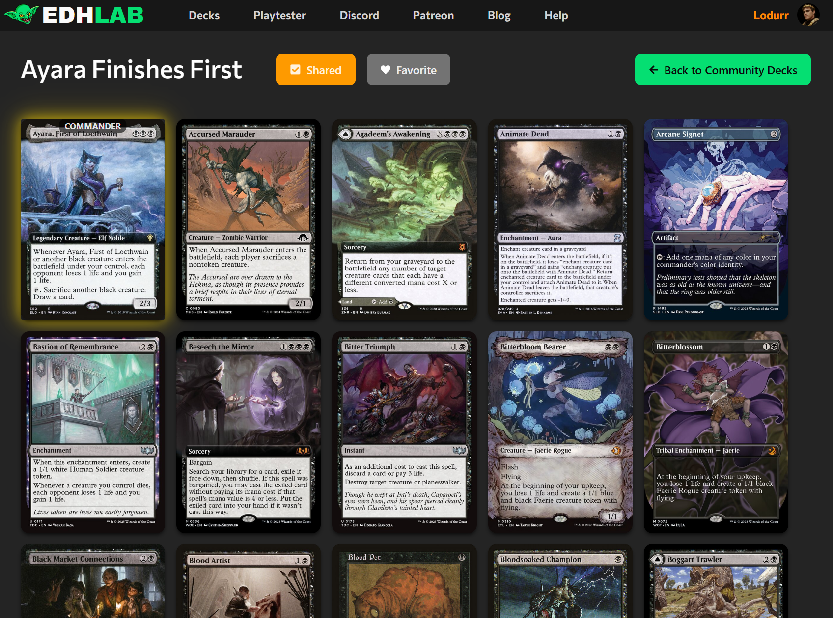 If you want to try out these combo lines in a playtest, here's a link to an Ayara, First of Locthwain list with all of the cards mentioned in this article: https://edhlab.gg/decks/25585. Add this deck to your favorites and play it against a few of your own decks, or other decks made by EDHLAB community members.