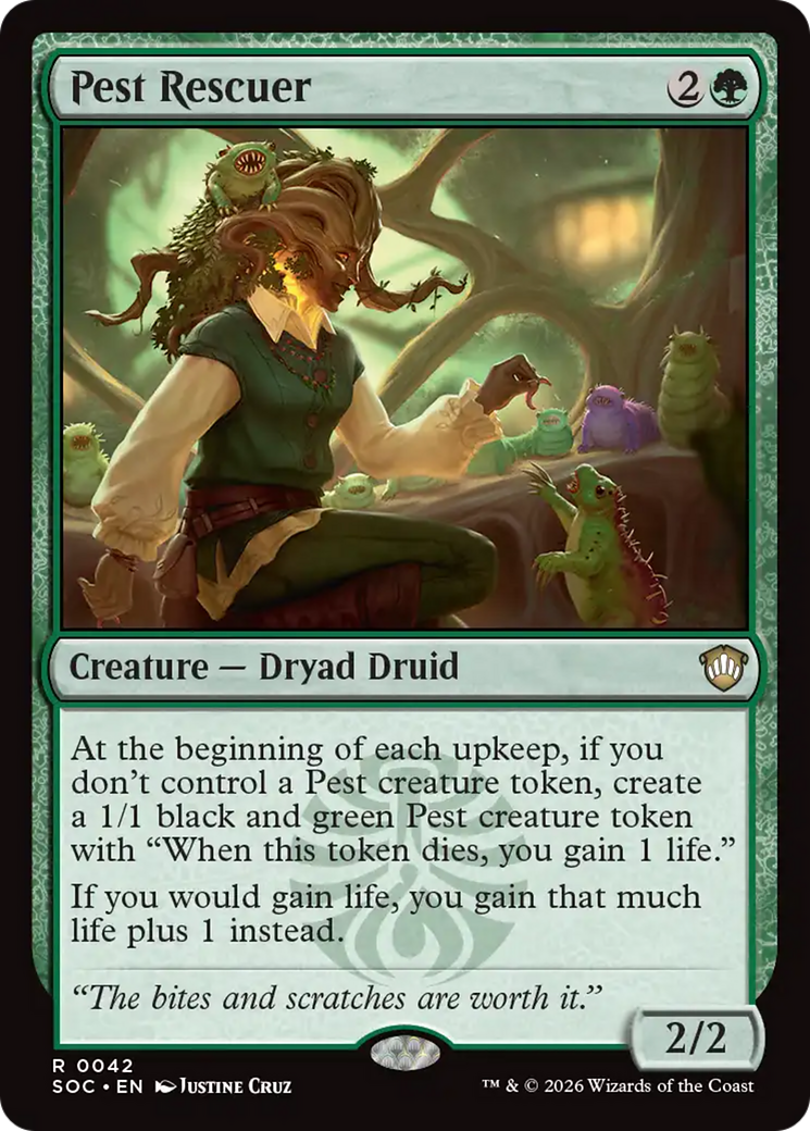 The deck comes with some old and new token generators that are a big part of our token package. Pest Rescuer is a green-shifted Ophiomancer (also present in the deck) who improves on the formula by adding a static ability that increases any instances of lifegain by one point, and creates Pest tokens instead of Snake tokens. The "each upkeep" clause is key, because we want the opportunity to trigger Dina's draw ability on everyone's turn, not just our own, and with just one instant-speed sacrifice outlet we can do that and live the Aristocrats dream. Just be sure you don't have other Pest creature tokens lying around, as her trigger is conditional on not controlling a Pest token on each upkeep.