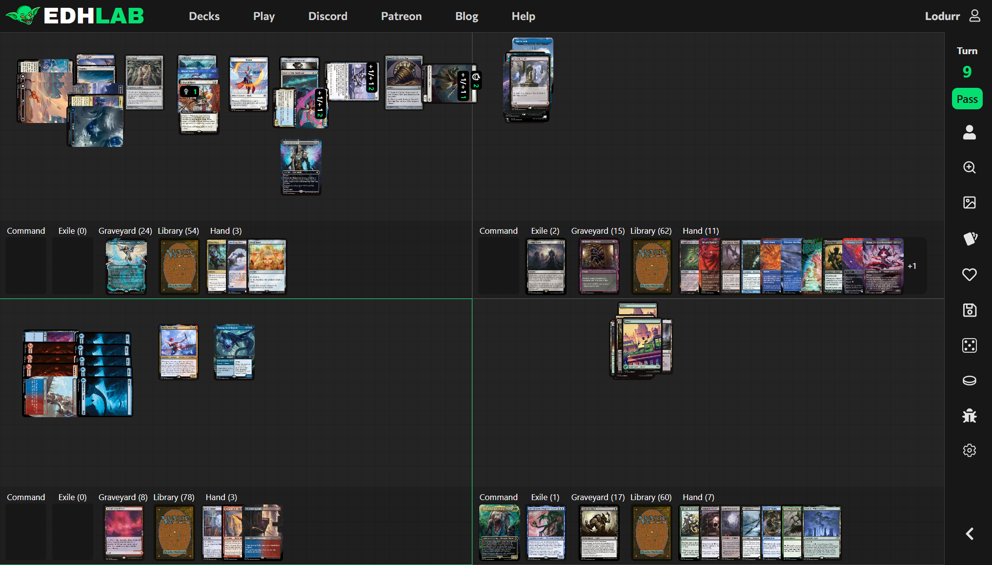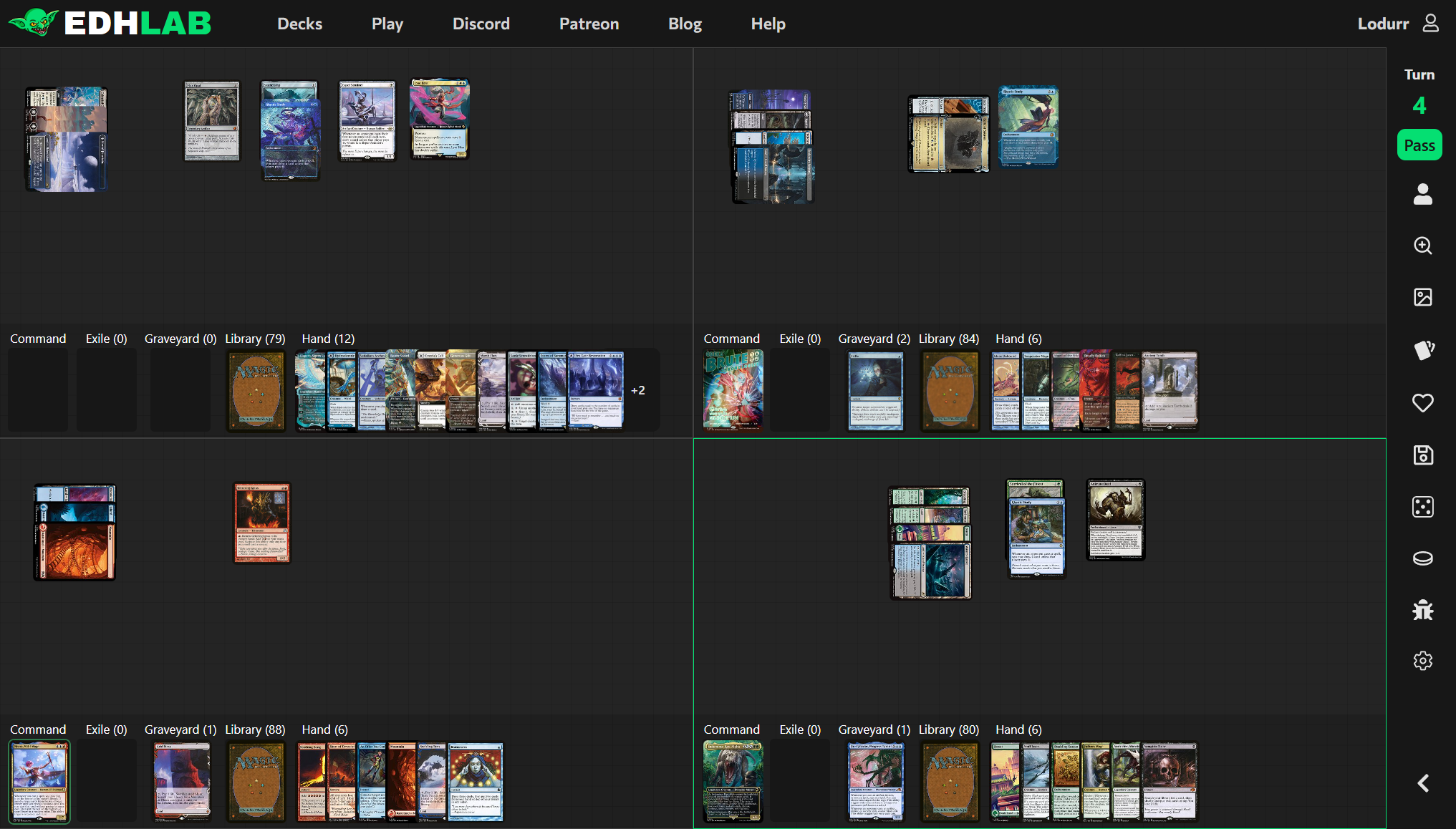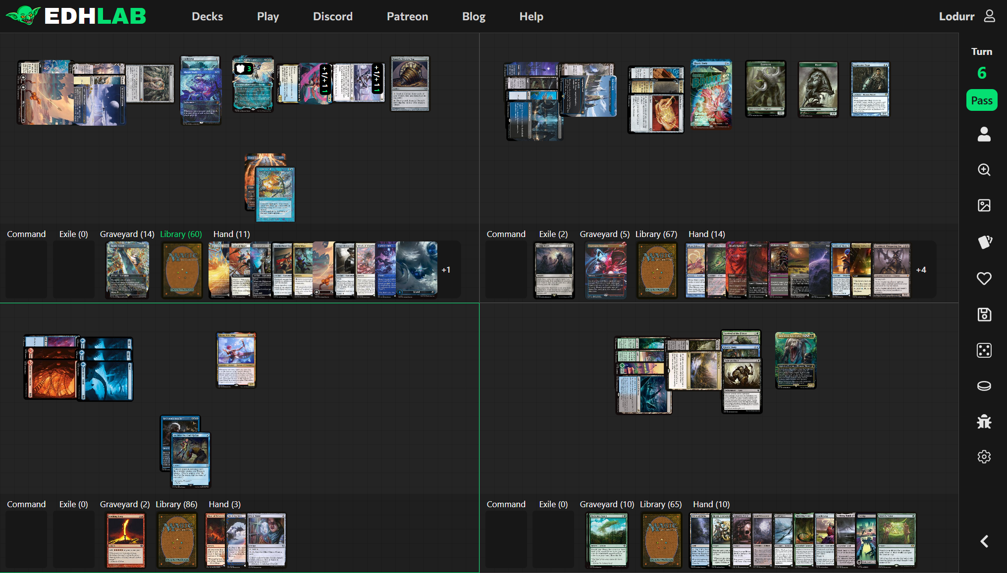 Unfortunately for Neera, her opponents have been drawing cards. Lots of cards. Neera, on turn 6, has 86 cards remaining in her library; Lyse has 60; Obeka has 67; and Indominus has 65, due almost entirely to Rhystic Study triggers.
