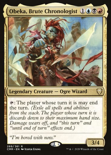 This Grixis reanimator list makes the most of Obeka's end-of-turn trigger-exiling ability. With big hitters like Archon of Cruelty and cards like Reanimate to pull them out of the graveyard quickly, casting Obeka isn't a requirement to get this deck off the ground. It uses Obeka for casting extra turn spells with delayed "you lose the game triggers" — like Final Fortune — without actually losing the game, as well as for dodging the downsides of cards like Sneak Attack and Twinflame.