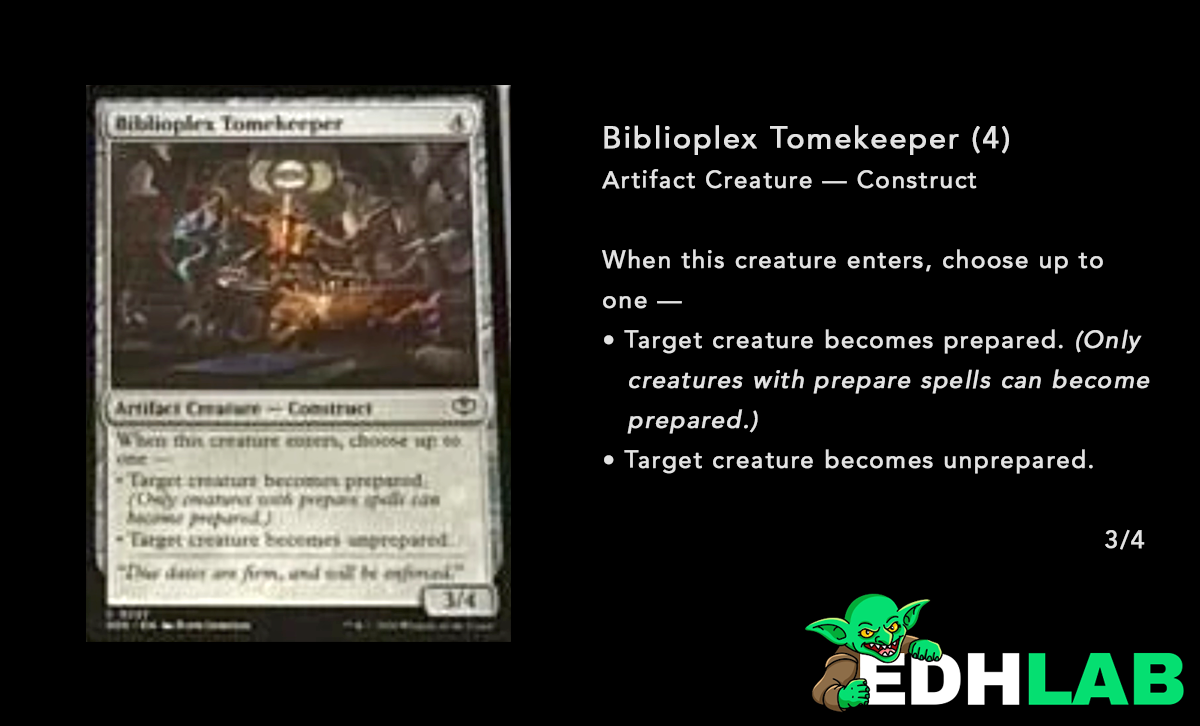 Finally, Biblioplex Tomekeeper presents a third possible benefit. It might be one of several ways to cheat on prepare's normal mana cost. Using a flicker spell suite with the Tomekeeper could let you repeatedly prepare a creature's spell, or remove the prepared condition from an opponent's creature, which either forces them to use their spell at an awkward time (if it's an instant) or cause them to lose their mana investment.